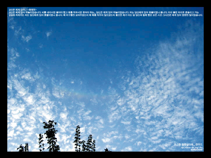 당신은 제게 있어 하늘이었습니다. 비를 내리시면 울어야 했고 해를 띄우시면 웃어야 하는,,, 당신은 제게 있어 하늘이었습니다. 저는 당신에게 있어 촛불이였나 봅니다. 이리 불면 저리로 흔들리고 가는 입김에 꺼져가는 저는 당신에게 있어 촛불이였나 봅니다. 왜 비구름만 보여주셨는지 왜 해를 띄우지 않으셨는지 물으면 제가 아는 답 당신과 함께 했던 모든 시간 그시간은 제게 있어 영원한 빛이었습니다.