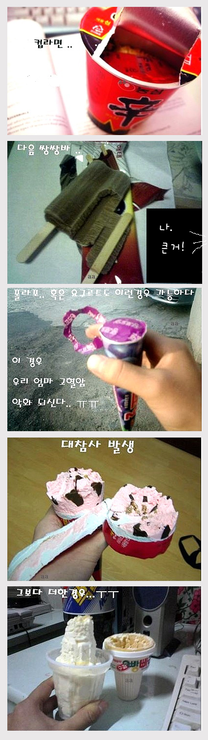 전 베스킨거시기에서 두개를 샀는데, 하나가 뚝 뿌러져서 내동이이... 근데 이쁜 아가씨가 다시하나 만들어주더라구요^^ 그때 어찌나 당황했던지...