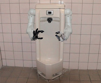 그는 아주 황당한 물건을 하나 발견해 소개했는데, 그것은 다름 아니라 로봇 팔이 달린 남성용 소변기였다. 샤케트론이라 불리는 이 로봇 소변기는 4월초부터 서구의 블로그를 강타하고 있는 초강력 아이템이다.