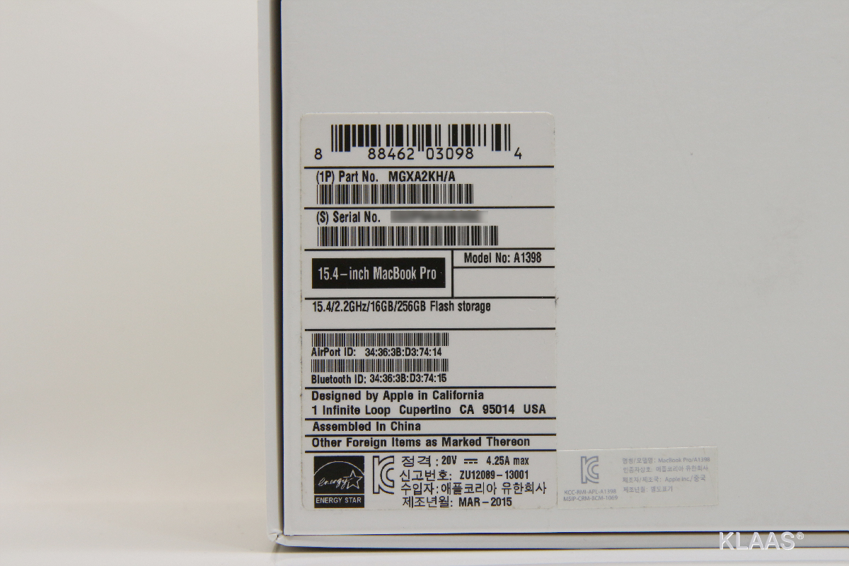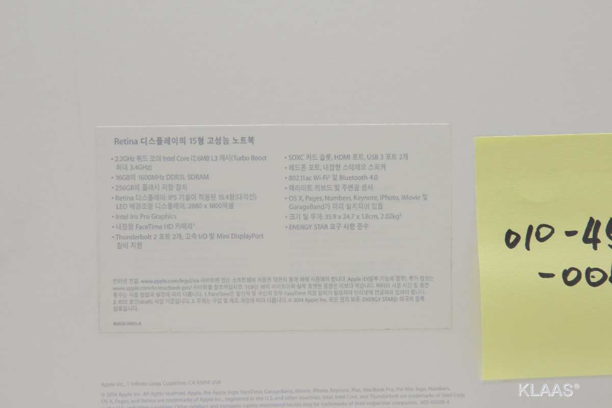 제품 사양: 인텔 / 코어i7-4세대 / 크리스탈웰 / 2.2GHz / 39.11cm(15.4인치) / 2880x1800 / LED백라이트 / 광시야각 / 베젤없음 / 16GB / DDR3L / SSD / 256GB / Iris Pro 5200 / 시스템메모리공유 / 802.11 n/ac 무선랜 / 블루투스 4.0 / HDMI / 웹캠 / USB 2.0 / USB 3.0 / 썬더볼트 / 멀티 리더기 / 블록 키보드 / 키보드 라이트 / Mac OS X Mavericks / 1.8mm / 2.02Kg / 색상: 실버 / 하스웰 레티나 맥북프로