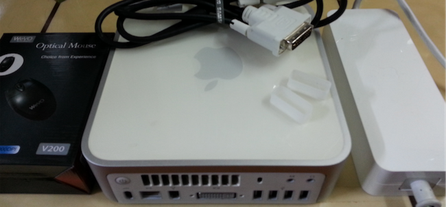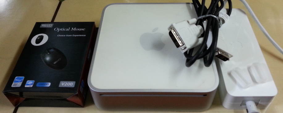 애플정품전원어댑터와 마우스와 모니터연결케이블과 맥미니본체입니다