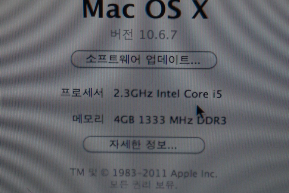 인텔 / 코어i5-2세대 / 2.3 GHz / LED백라이트 / 베젤없음 / 33.78cm(13.3인치) / 1280x800 / 320GB / 4GB / DDR3 / DVD레코더 / Mac OS X / 인텔 / HD 3000 / 시스템 메모리 공유 / 2.04Kg / 리튬 폴리머 / 탈착 불가능 / 1Gbps 유선랜 / 802.11 b...