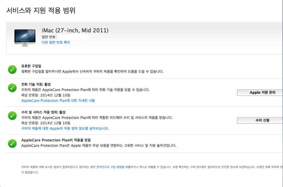 애플케어는 2014년12월10일까지입니다.