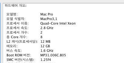 CPU : MAC PRO 2x2.8Ghz Quad-Core Intel Xeon (총 8코어)