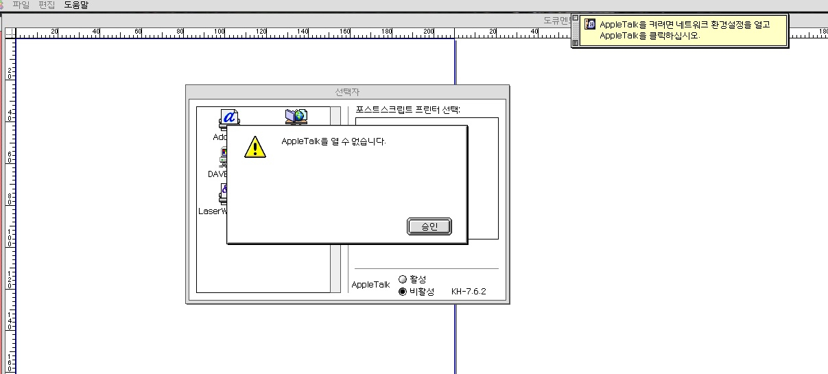 "Apple talk 네트워크에 연결되어 있는 확인하십시오" 라고 나옵니다.
