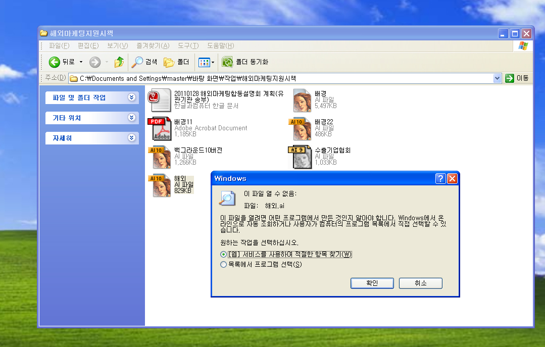 "목록에서 프로그램 선택"으로 "일러스트" 실행 프로그램을 한번만 찾아 지정해 주면 그 뒤부터 이 메세지는 나오지 않습니다.