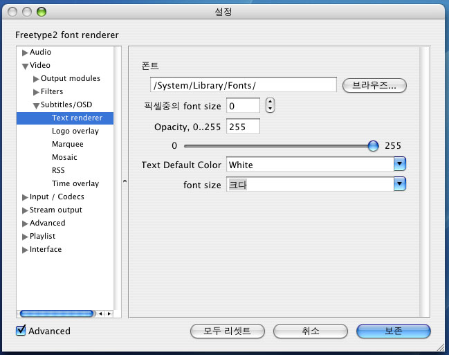 다시 설정에서 video->subtitles/osd->Textrenderer에서 폰트를 정해줍니다..