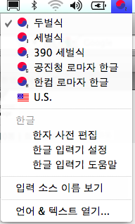 시스템 환경설정에서 ->다국어 -> 입력메뉴 에서 문자팔레트에 체크하시면 태극마크 아래에 메뉴가 추가 됩니다
