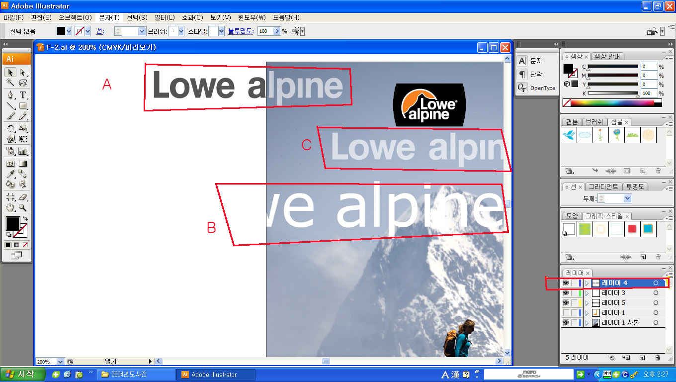 A는 먹글씨고 레이어가 제일위에있는데도 사진과겹치는부분이