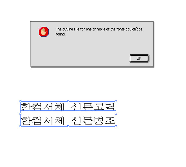 일러스트9.0에서 아웃라인을 시키면 다른서체들은 잘 적용되는데 #한켬서체만 아래와 문구가 뜨면서 아웃라인이 안됩니다. 사무실 레이져프린트나 출력실은 아무문제없고 유독 일러에서만 적용이 안돼네요.
