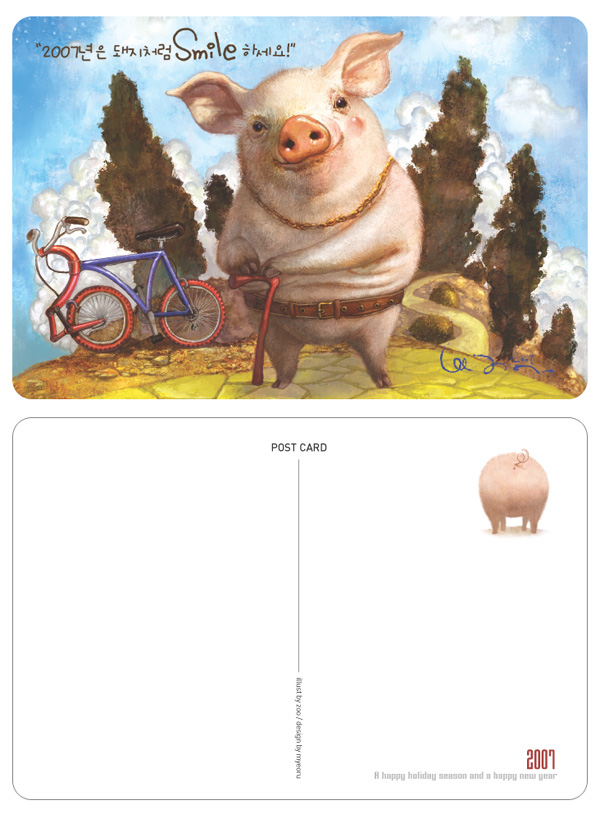 2007년(자전거) 돼지처럼(돼지그림) smile (길모양S +길이mile) 우와~ 방장님 굿입니당^^ 전 그냥 .... 2007년(자전거) 돼지처럼 smile 하세요(돼지가 웃고있어성 ㅎ) 일케 이해해 버렸다능..... 일러스트 굿.....ㅎ 엽서 굿.....ㅎㅎ
