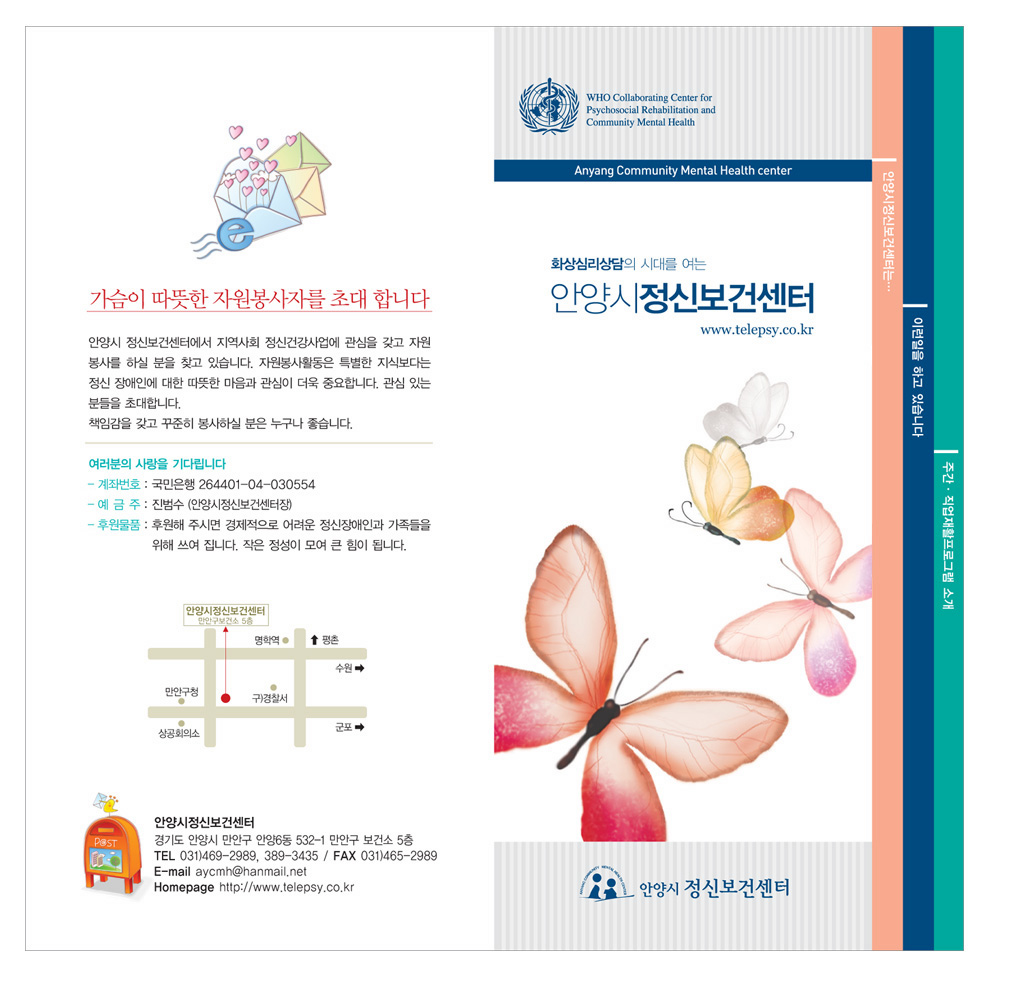 정신보건센터와 어울리는 색상배열인거같아 보기좋아요^^+ (혹, 표지 전면 파란띠에 들어간 영문에서 마지막 center <- 앞에 C짜 대문자여야되는거 아닌가요?;;;)