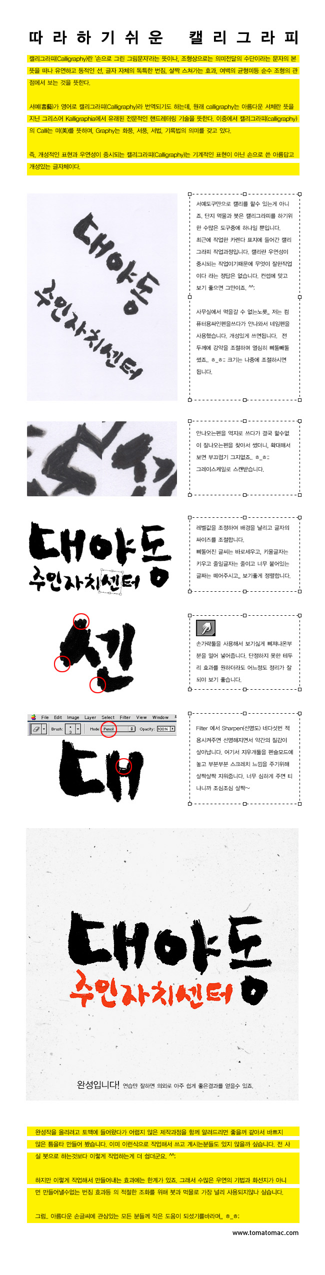 누가 그래요. "이걸캘리라고올렸어?" ㅜㅜ 작품평은하지말아주셔요 인쇄안나왔으니 아직은 습작.. ㅎㅎ 방법만 참고하셔요. 담에 더 쉽고 좋은방법있으면 또 올려 볼게요. ^^ ..) 쑤니언니, 스크래치는 사실 붓터치가 제일 자연스럽죠. ^^ 그리고 시흥시님, 군포시 대야동입니다. ^^