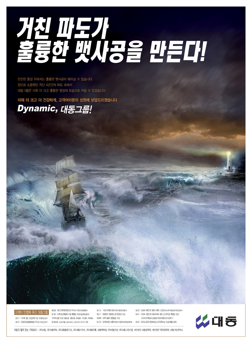이미지 한두컷으로 합성된것 같지 안네요...대단하십니다... 작업시간점 걸리셨을듯...^^ 저두 아랫것에 마음이 가네요..."대동건설"? "대동맥" 연관성이 좋네요.. 특히 스팩이 없다는점이 더욱더...간만에 좋은광고 보고갑니다..
