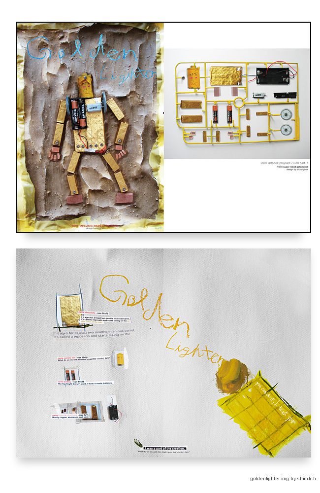 컨셉 : 70-80년대 우리의 우상이었던 로봇만화의 주인공을 모티브로 제작하여, 다시금 그때의 향수를 느끼고 새로움을 느낄수 있는 디자인 아트북입니다. 타겟층은 역시 20-30대가 타겟입니다. 로봇을 좋아했던 사람에게 소장하고 싶게 제작하는데 목적을 두고 있습니다; 어릴때 제작자인 저의 입장에서 봤을때 프라모델에서 때어내는 그 느낌이 너무나 그립더라구요..^^;