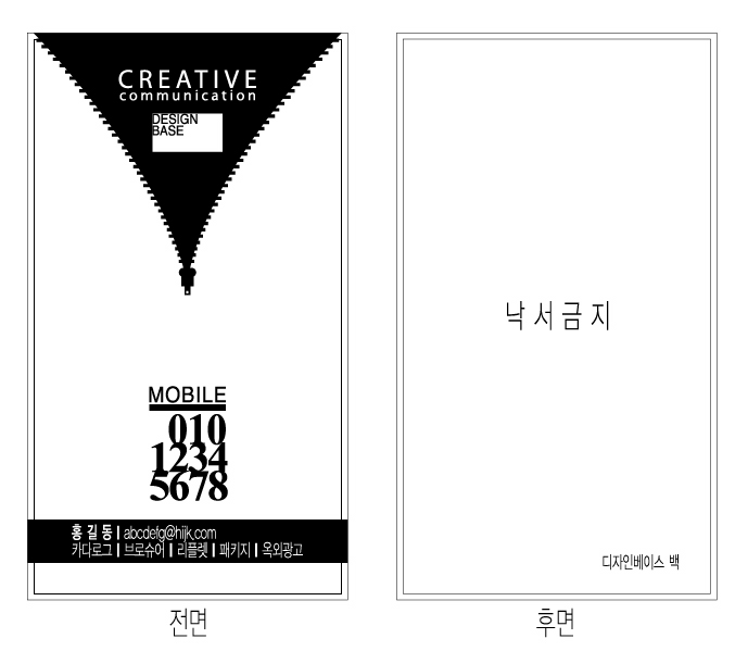 전 무조건 신선해서 좋아요.. 일단 명함에서 디자이너란 냄새가 물~~~씬 풍기네요.. 오버만 하지 않는다면... 낙서금지같은..... ㅋ 명함이란게 그래도 좀 고지식한면이 있으니까요...^^ 용기가 필요~