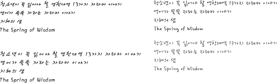 세종소주체, 봄날체로 좀 부탁드려용~~ Voyager 일반 0 3687 2009.01.19 19:00 -0001.11.30 00:00 vo.ai (0byte) + 31 > > 청소년이 꼭 읽어야 할 영한대역 13가지 자타카 이야기 > 영어가 쑥쑥 자라는 자타카 이야기 > 지혜의 샘 > The Spring of Wisdom > > 부탁드려용~~ >
