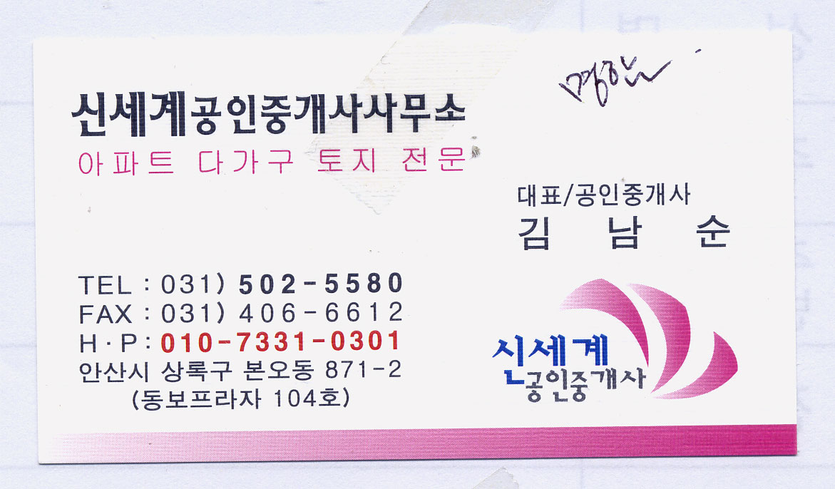급히 글씨 부탁드립니다~ 조희진 일반 0 3746 2009.05.16 11:43 오늘 들어가야 하는 건데 글씨체가 없어서요~ 똑같이 해달라고 하셨는데~ 상호명하고 하단 상호명 부탁드립니다. 신세계공인중개사사무소 신세계공인중개사