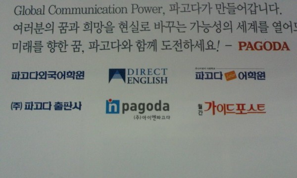 [급]파고다관련 로고소스좀 부탁 드려요 티엔미 0 7032 2010.10.27 18:34 파고다외국어학원 DIRECT ENGLISH파고다주니어어학원(주)파고다출판사NPAGODA(주)와이엔파고다월간 가이드포스트